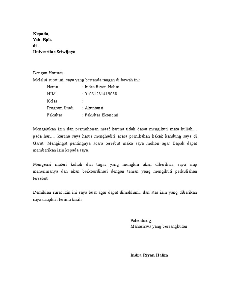 Contoh surat izin kuliah karena kerja surat izin kuliah karena kegiatan ukm 14. Savesave contoh surat pelepasan kuliah for later. Mungkin saja karena sedang dalam keadaan sakit, sedang ada urusan, sedang ada acara keluarga, sedang pulang kampung, atau. Kamu dapat mengembangkan isi maupun salam pada suratmu, akan tetapi tetap harus memuat informasi yang singkat dan tepat agar mudah dipahami. Surat izin adalah pernyataan tertulis yang bertujuan memberikan keterangan bahwa orang terkait telah diberi izin atas suatu tindakan tertentu.