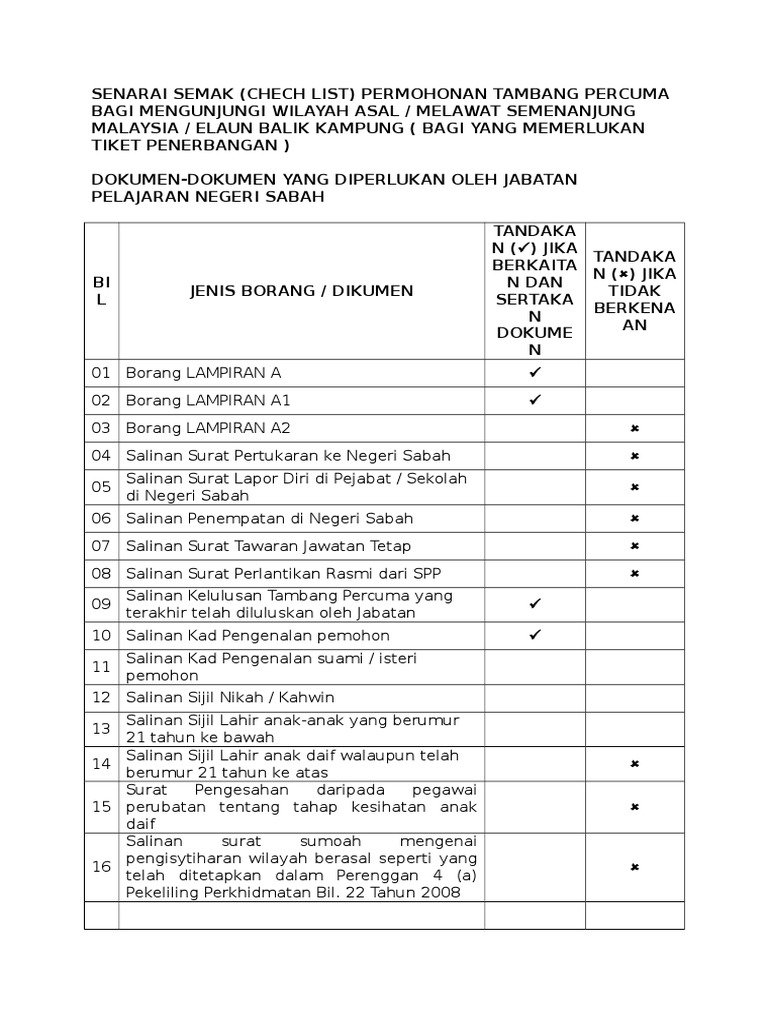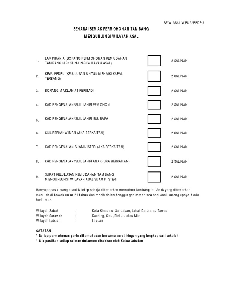 Senarai Semak Borang Permohonan Kemudahan Tambang Mengunjungi Wilayah Asal / Contoh surat akuan sumpah dan perjanjian pelepasan penerimaan tukar majikan(kematian majikan asal).. Borang permohonan lampiran a permohonan kemudahan tambang mengunjungi wilayah asal 2 salinan. Permohonan pegawai (sila tanda (√) di ruangan berkaitan). Isteri/suami/anak dari ibu negeri wilayah asal/bandar utama untuk melawat saya. 1 salinan kad pengenalan penghibah. Permohonan hanya boleh dimasukkan ke dalam sistem setelah fi yang lengkap diterima.