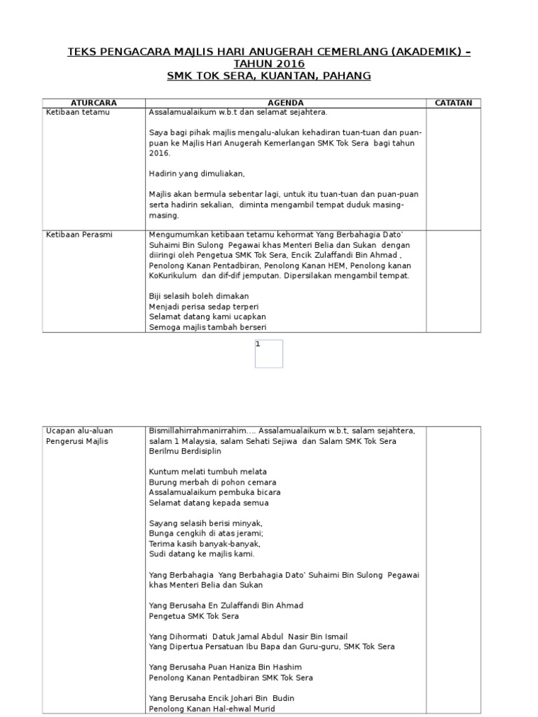 Teks pengacara majlis untuk ceramah program kesedaran & pencegahan malaria sempena sambutan hari malaria sedunia peringkat negeri pahang. Selamat datang ke, majlis, hari anugerah cemerlang, sk taman molek. Teks pengacara majlis anugerah kecemerlangan pelajar mp3 & mp4. Please fill this form, we will try to respond as soon as possible. Untuk menyampaikan anugerah kepada pelajar yang mendapat keputusn cemerlang. Teks pengacara hari anugerah cemerlang akademik. Teks pengacara program / bengkel. Mohon maaf dari meja pengacara sekiranya ada terkasar bahasa, terlanjur bicara sepanjang mengendalikan majlis. Untuk memberkati lagi majlis kita pada hari ini saya menjemput dan mempersilakan saudara zul hasanain bin hasim untuk mengaminkan. Disini admin nak kongsikan bahan tersebut. Pada pandangan saya, majlis ini patut diteruskan. Dapatkan teks pengerusi majlis anugerah kecemerlangan. Guru boleh edit mengikut kesesuain majlis yang dibuat.