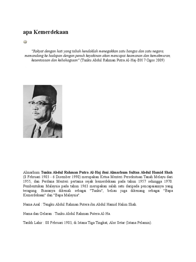 Setiap kali tibanya 31 augus setiap tahun, pastinya kita akan mendengar laungan merdeka! Tunku abdul rahman merupakan anak lelaki yang ketujuh kepada sultan abdul hamid halim shah. Seluruh negara berkabung atas pemergian almarhum. تونكو عبدالرحمن ڤوترا الحاج ابن المرحوم سلطان عبدالحميد حاليم شاه; Agar generasi turut pertahankan, menjadi warisan sejak berzaman.